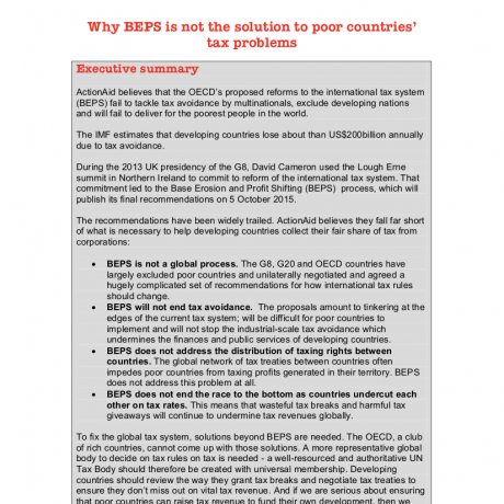 ActionAid believes that the OECD’s proposed reforms to the international tax system (BEPS) fail to tackle tax avoidance by multinationals, exclude developing nations and will fail to deliver for the